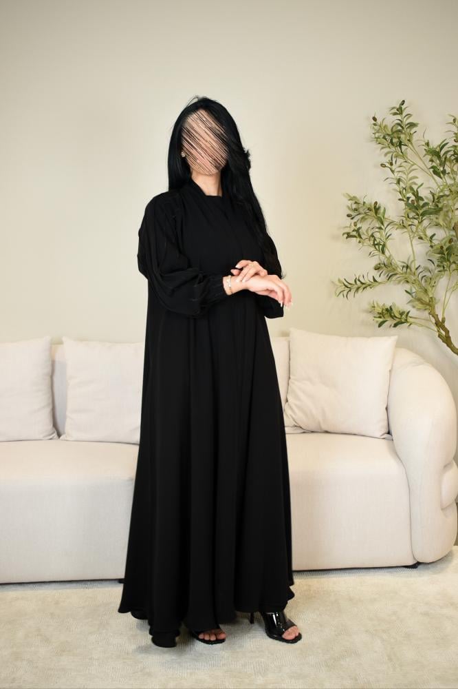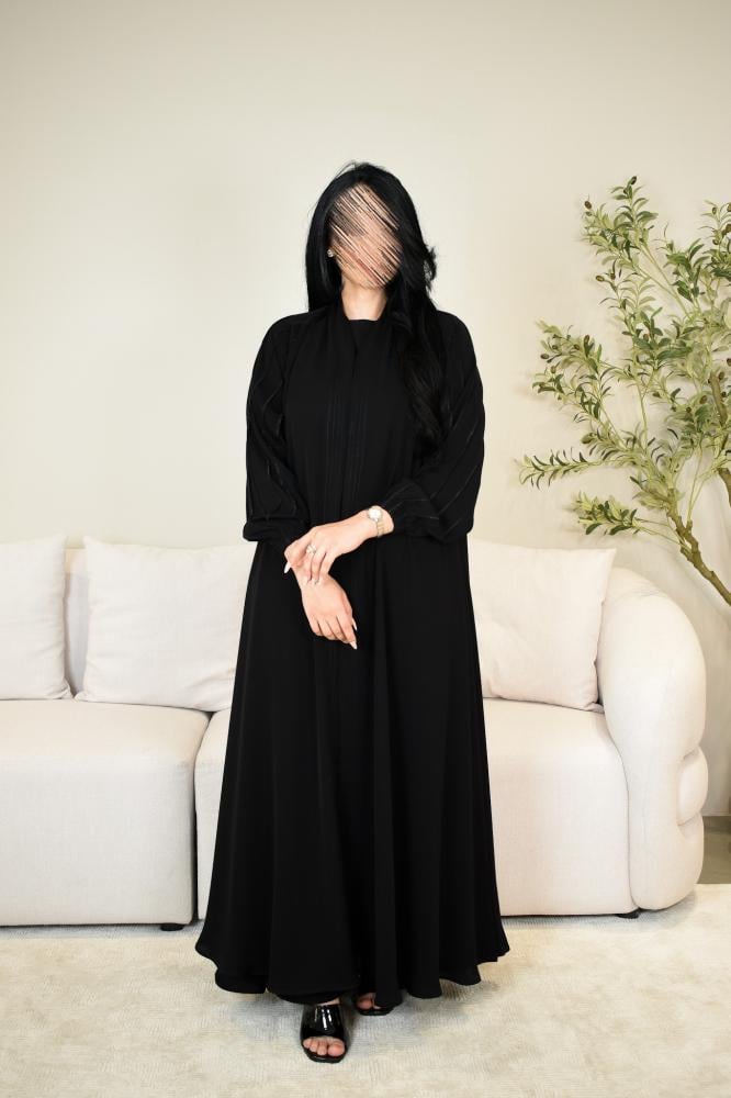 عباية بتصميم مميز وأنيقة وأكمام مزمومه مريحه قماشها اسود فاحم